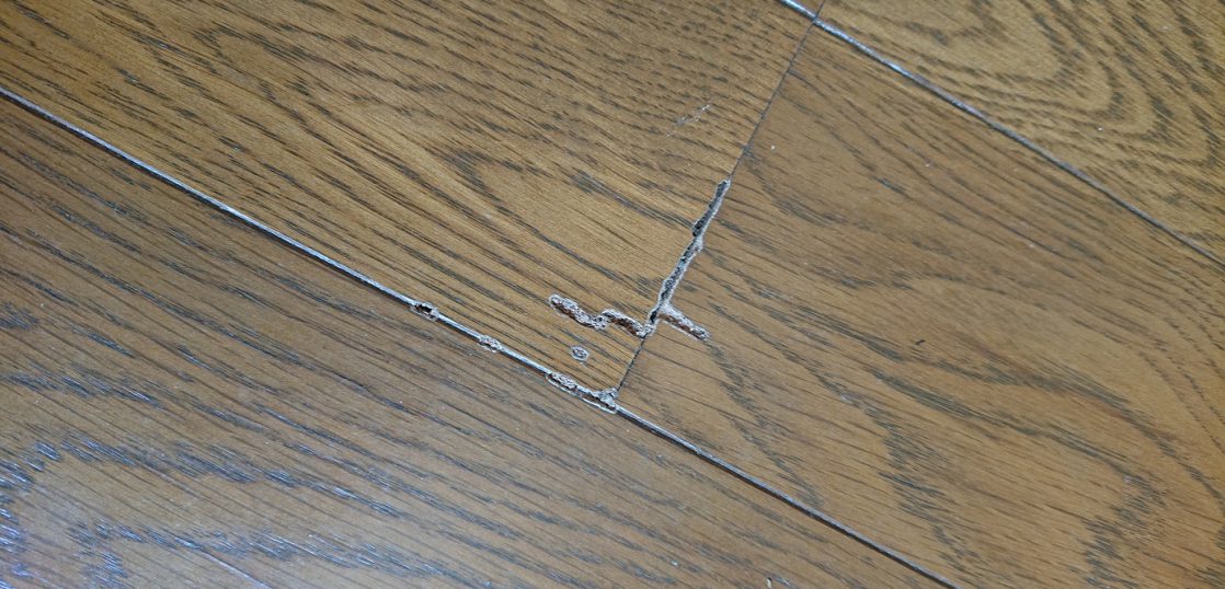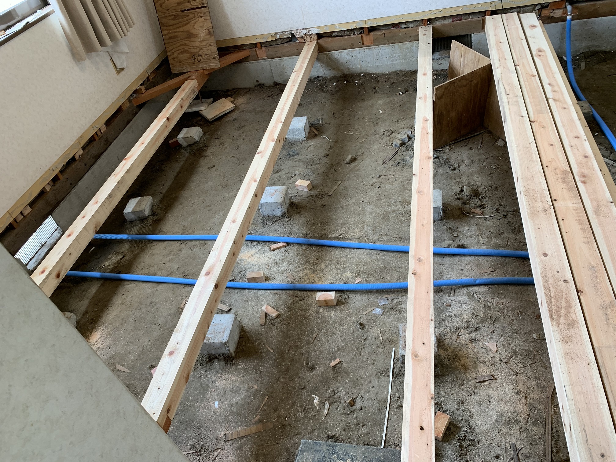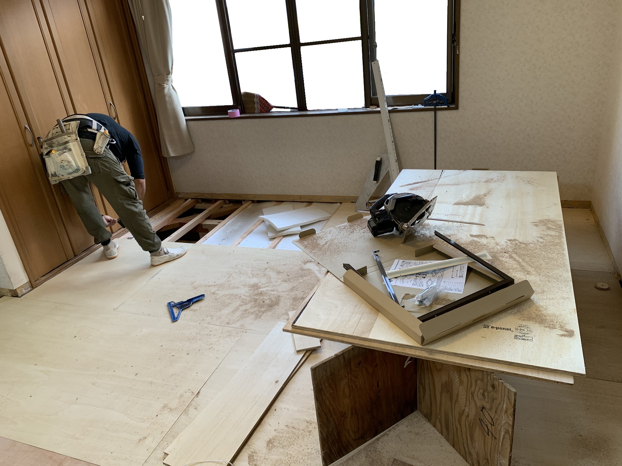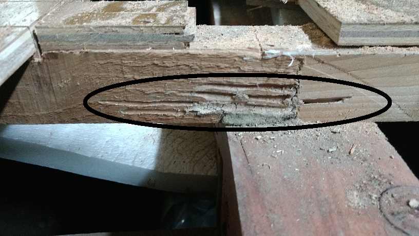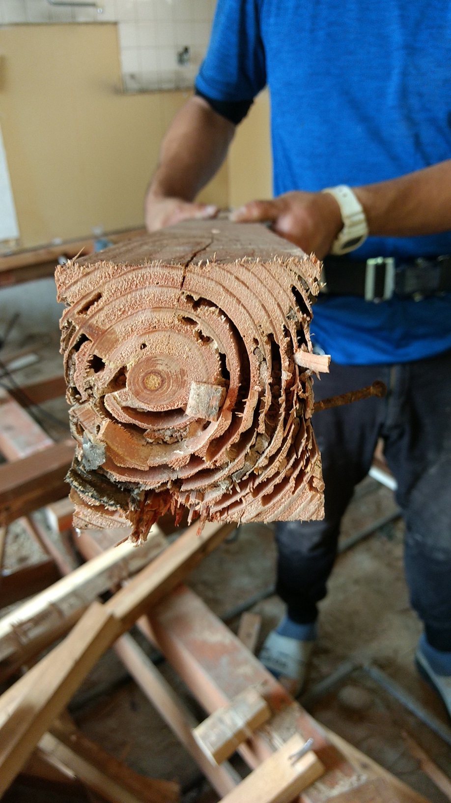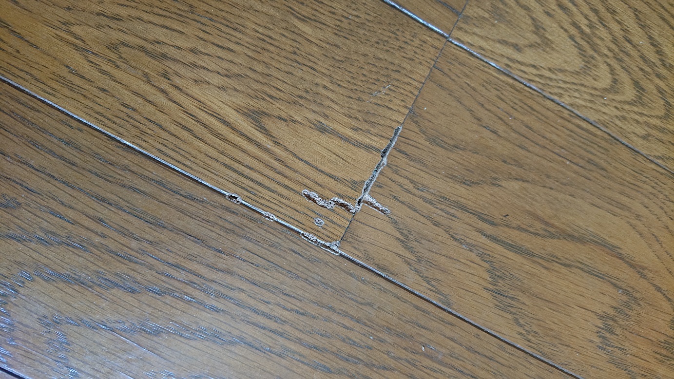 退去して判明。アパートのシロアリ被害 2020年10月2日 officekojima-editor 先日、とあるアパートの退去の立会いに行ったところ、 クローゼットの中の隅に怪しい塊を発見。 フローリングにも穴が・・・ 床を剥がしてみたところ、なんと白蟻がお食事中でした。 根太には白蟻が舐めて行ったような痕跡が。 そして、驚くべき光景がこちら。 大引き(根太を支える重要な部材)が字のごとく虫食い状態でした。 シロアリ被害を見つけたら、被害が広がる前に、早急な工事が必要です。 餌を見つけた彼らは、刻一刻と食べ進めてしまいます・・・。 今回は、床下の骨組みから床板まで交換です。 5年保証の防蟻工事とともに完成しました。